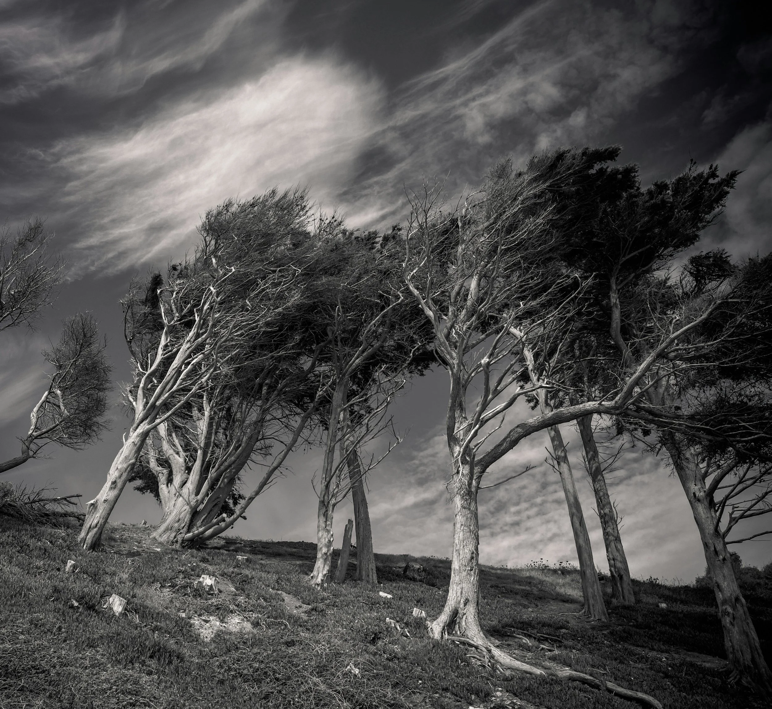 A nearby tree is bare and brittle with divots,