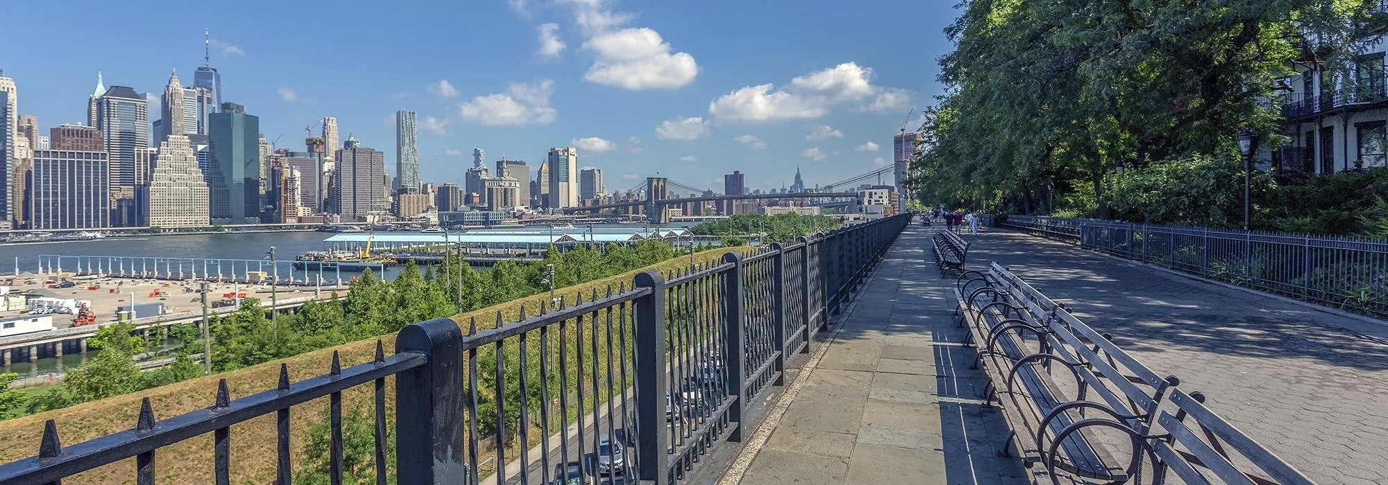 Elevated above DUMBO and behind stunning Brooklyn Heights brownstones is a Promenade that unveils one of the most striking vistas of the Manhattan skyline. Governor’s Island peers from the left and Jersey peeks over from the distance. Bridges both Brooklyn & Manhattan frame the centerpiece.