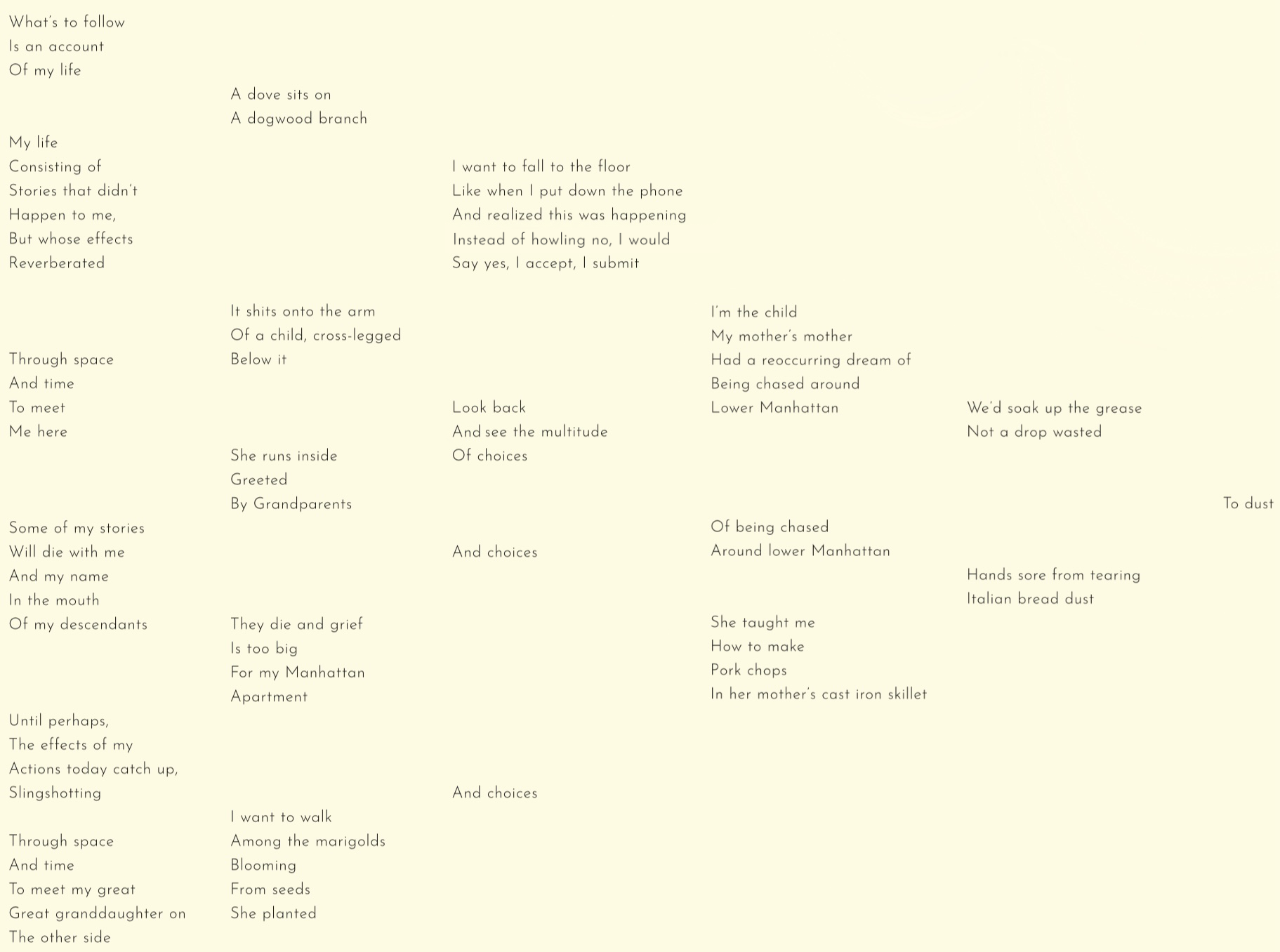 It is perhaps a poet and artist’s job to observe and remember. But remembering is not as simple as we allow ourselves to believe. Sabrina Tenteromano writes “My life / Consisting of / Stories that didn’t / Happen to me, / But whose effects / Reverberated / Through space / And time / To meet / Me here.” Our relationship to our past isn’t static; it changes as we do and changes the way we live our present. The poets and artists know this, observing and remembering with great detail and depth, allowing us to better understand the moment and the lives we inhabit.