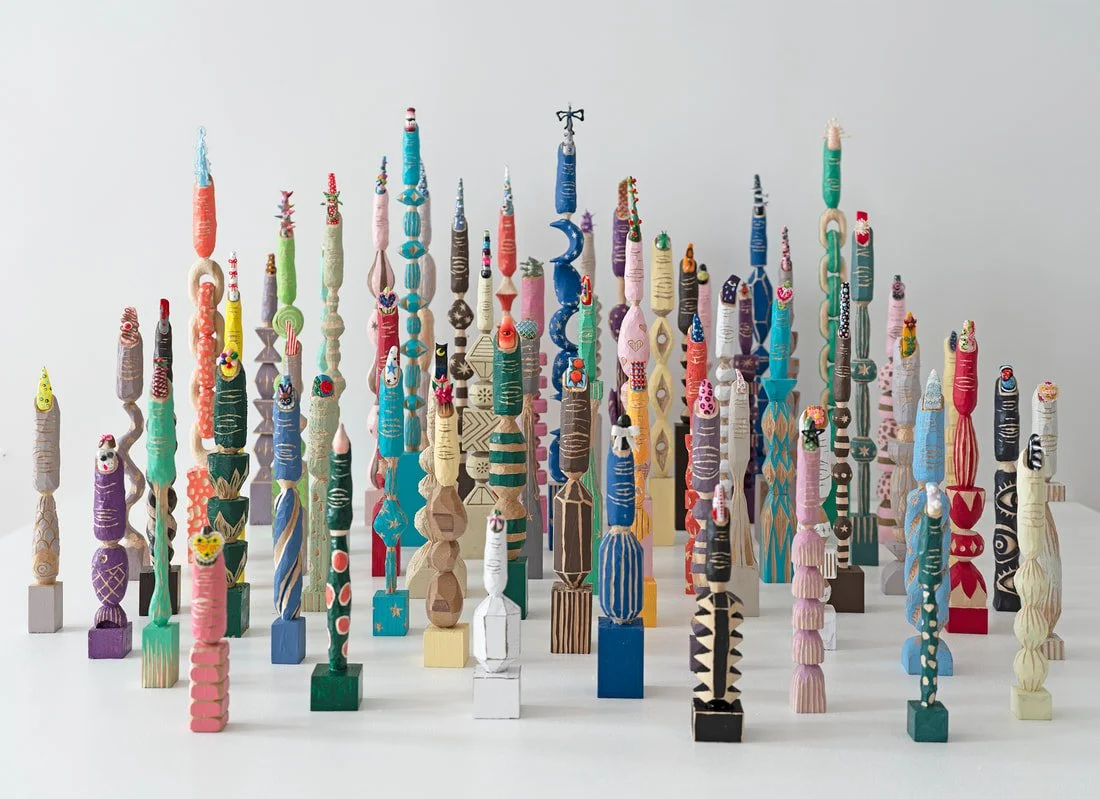 The work is several dozen hand carved wooden sculptures each measuring seven inches to two feet. The lower parts of the sculptures are carved into abstract shapes and top parts into fingers. They are painted and engraved, and manicured artificial nails are attached on the fingertips. The long vertical shapes and their grouping conjure impressions of candles, totem poles, monuments or Kokdu dolls (traditional Korean wood craft that were made to decorate funeral palanquin).