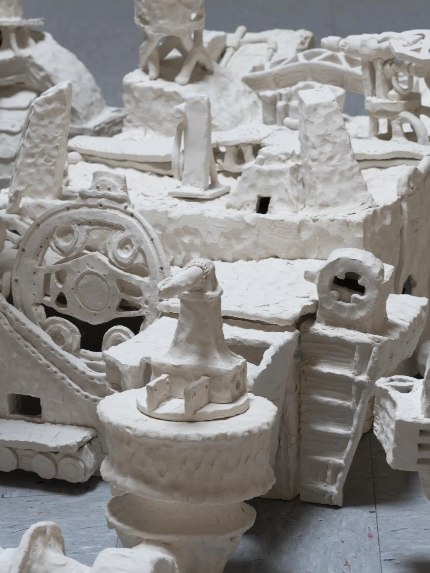 glazed porcelain, epoxy clay, yarn, pieces from a Trendmaster Starcastle,