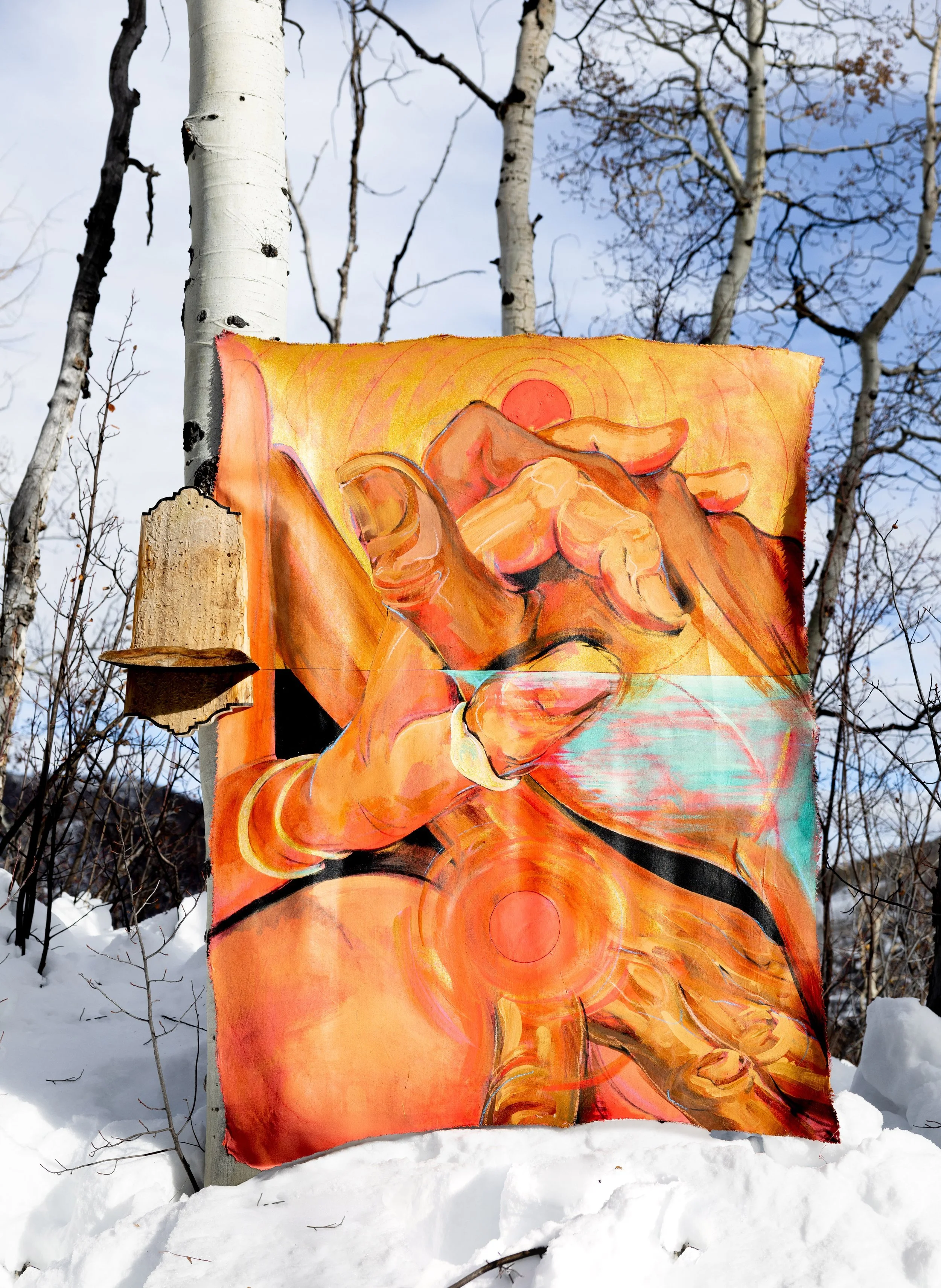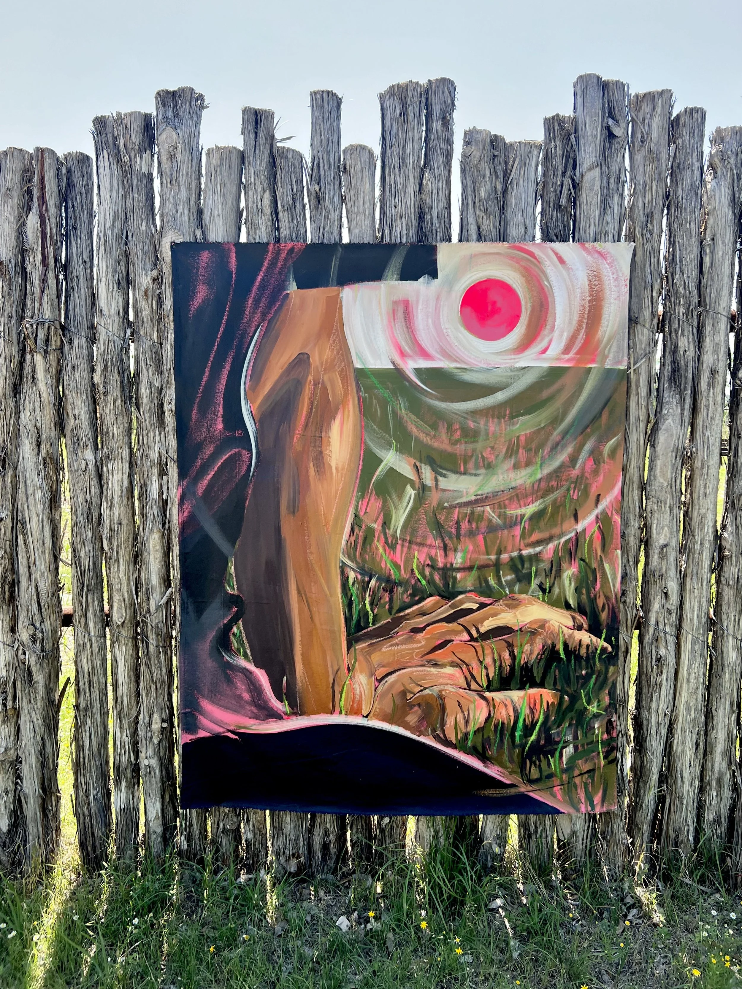 Leah Reusch is an interdisciplinary artist exploring intimate human connection to nature and community. Reusch works as a painter, poet, and installation artist in many mediums, as well as a wilderness field guide where she applies her art in natural teaching settings. Through large-scale abstracted natural painted scenes in her individual practice, Reusch widens the spaces between realism and abstraction, landscape and inner space, to open up room for viewer and artist, collective and individual, to find moments of truth and connection. Reusch’s work aims to pull closer the horizon of society vs. wilderness, human vs. being, until it is a blurred line and safe, accessible, decolonized place; a unity that inspires all to care for the earth and others as ourselves; a challenge against the inequity of outdoor spaces and inner hierarchies. Through wild gesture, vivid color and reactive, meditative painting, Reusch creates huge living paintings that she sees as an extension of her own body, a living breathing space. Reusch lives and works across the world painting and teaching on farms and in wilderness settings with youth and disabled people.