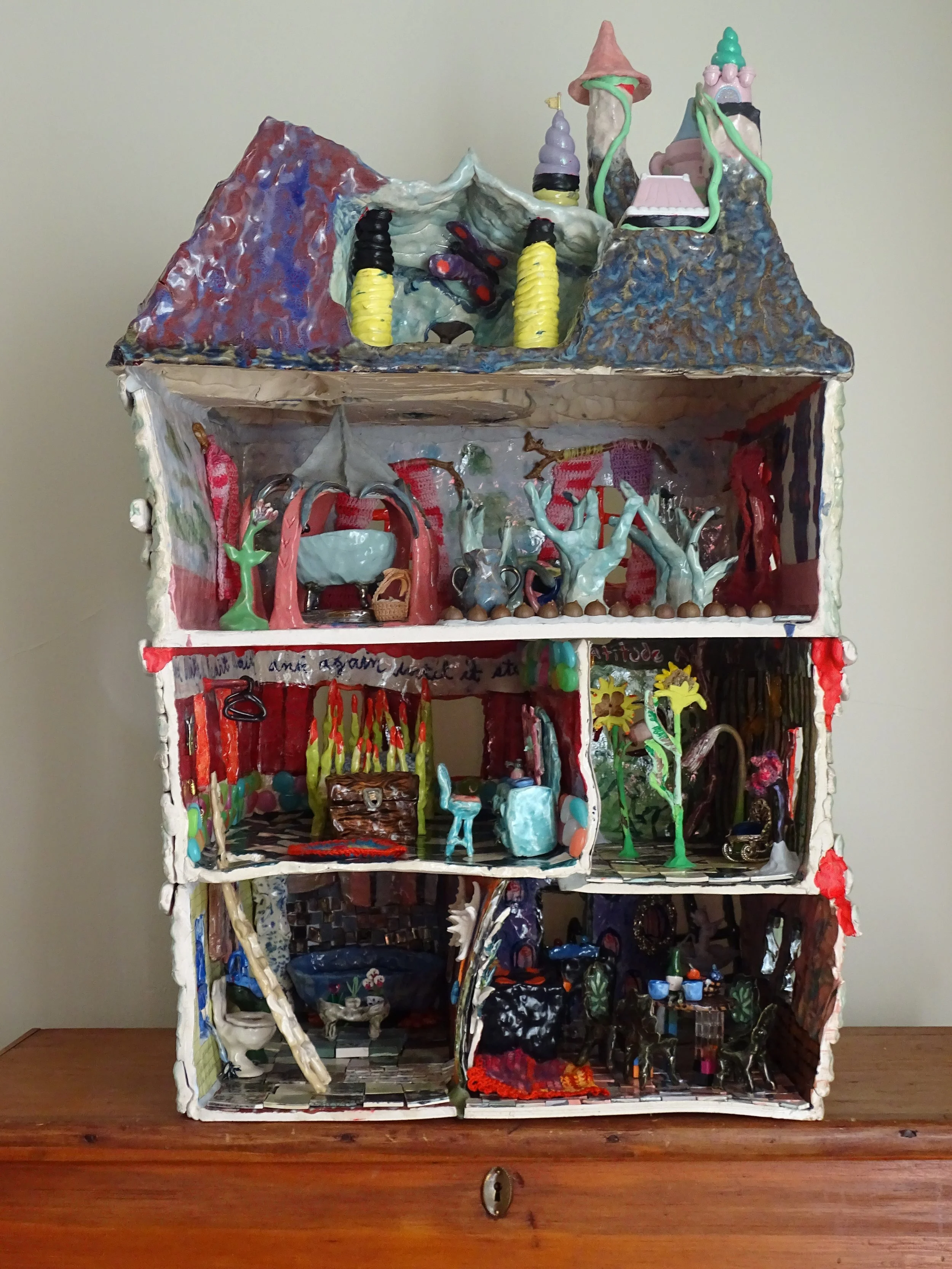 It is mostly all hand built ceramic (down to the tiles, etc. ) but there are also a few objects taken from my old dollhouse.